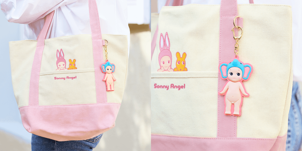 The tote bag features an adorable design of Sonny Angel and Robby Angel peeking out from their pocket as if